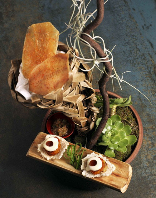 香脆鸡皮配秘制香柠辛辣酱、烧米饼、肉肠、烤大蕉、树蕃茄泡沫。树番茄原产于南美秘鲁安地斯山脉,这道开胃菜酸甜鲜香,盘饰具有盆景的艺术美感。
