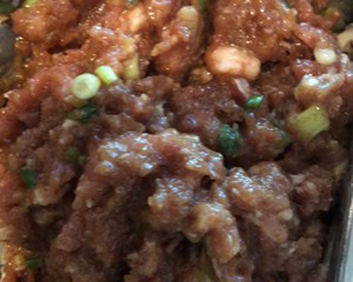 步骤二:猪肉馅250g,加入料酒1勺、生抽3勺、蚝油2勺、葱姜末、盐4g、芝麻香油1勺搅拌均匀,由于肉馅比较瘦,可以再倒入30g植物油。